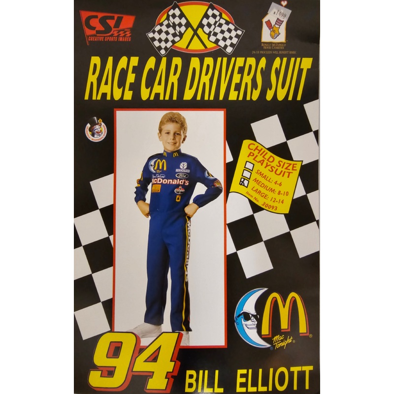 Vintage Race Car Driver SuitCIE / Atlas / Ronald McDonald House Charities1997 Bill Elliot Driver SuitIncludes: JumpsuitSize: Child LargeColor: As shownCIE30093