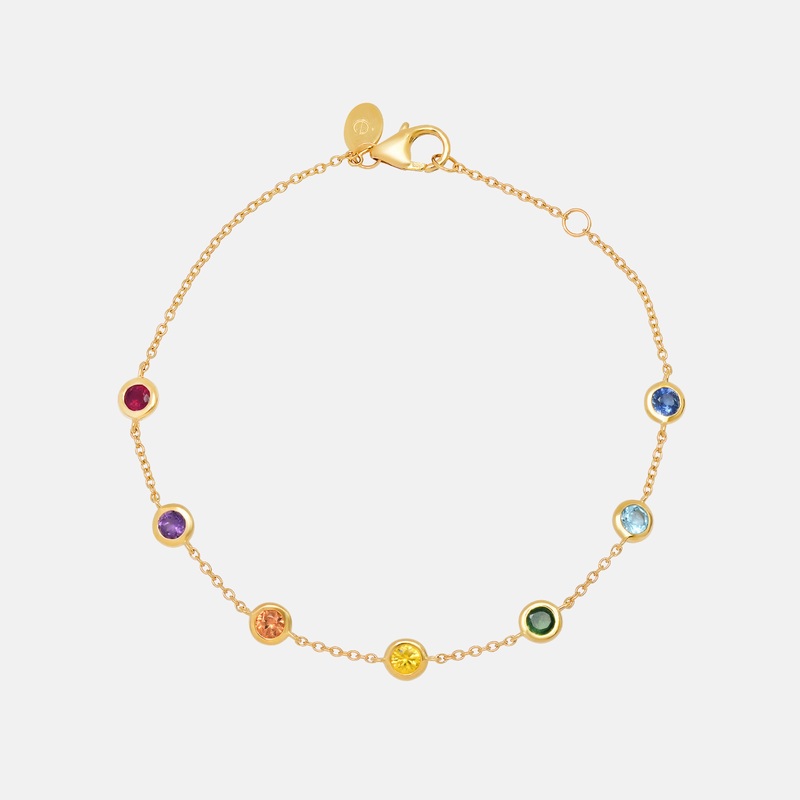 Timeless design, technicolor spirit. The 14K Gold Rainbow Bezel Set Bracelet features seven luminous gemstonesrubies, sapphires, amethysts, and aquamarineseach bezel set for a clean, classic finish. Stack it with your gold staples or let it shine solo as a vibrant celebration of color and individuality.