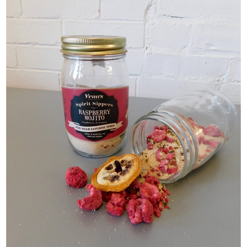 It’s a bar in a jar. Vena’s Spirit Sipper Infusion Jars are created with delicious ingredients that include freeze dried fruits, herbs, spices, and all natural, organic sweeteners. We put it in a jar; all you have to do is add your favorite spirit! Steep ~ Strain ~ Sip ~ Savor! INGREDIENTS: raspberries, lemon, lime, mint leaves, blend of organic cane sugar, cane syrup and honey Shelf life: 12 months.