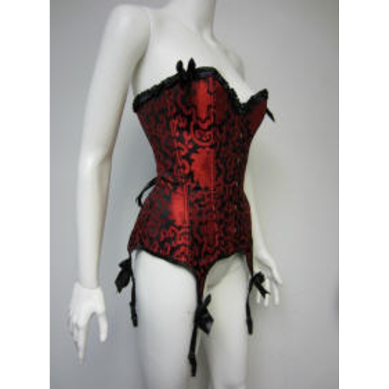 Includes: Lined corset features light boning for comfortable shaping. Black fabric with stunning red brocade. Trimmed at top with ribbondetailing. Attached garter straps with bow detailing. Front steel busk closure. Lace-up back.Size (Ribcage/Waist/Hip-7"