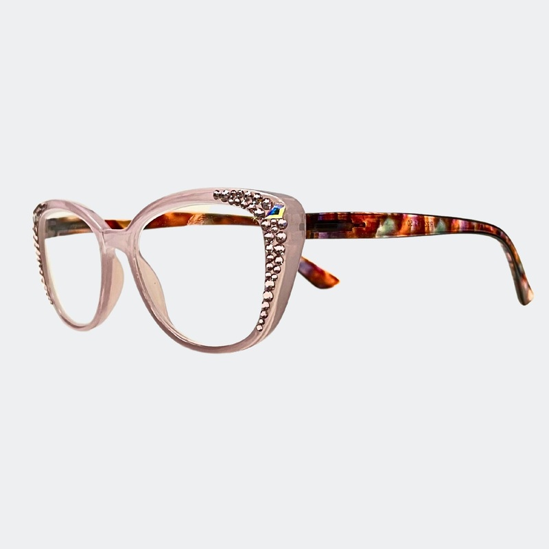 The REN - JCR676 cat-eyed reading glasses deliver a stylish injection frame embellished with intricate, hand-set crystals. A velvet lined carrying case and pouch ensure safe transport and storage, allowing you to bring this luxury design to any special eve