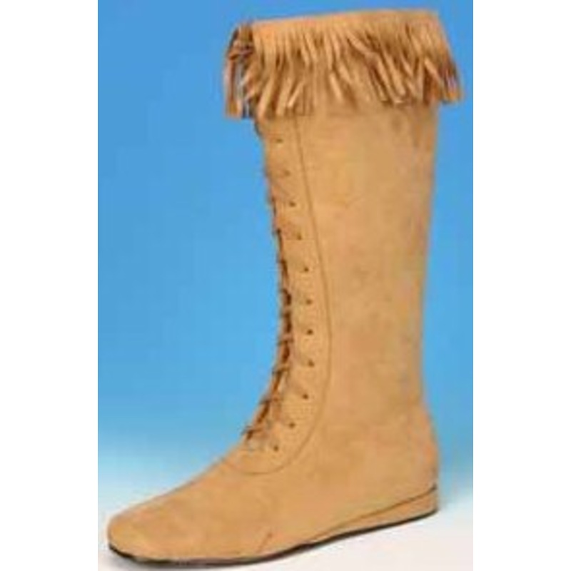 Heavy duty Front Lace with soft pliable inner tongue. Very good quality tan imitation suede Buckskin boot with beige sturdy material lining and soft foot pad as well as 3″ leather like fringe decoration at top. Soft comfortable rubber soles.Good for Hippies, Robin Hood, medieval, renaissance, Native Americans, Mountain Men, Early American and European Explorers. Great boot for”The Beauty and the Beast”
