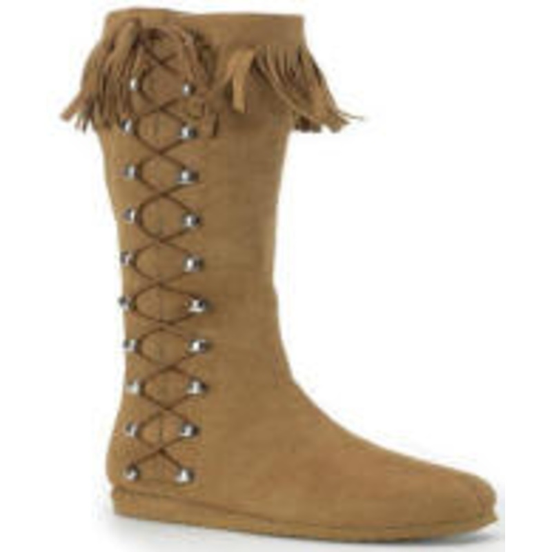 Heavy duty 14″ Side Lace with metal hooks and inner flap. Very good quality imitation tan suede Buckskin boot with tan sturdy material lining and soft foot pad as well as 3″ leather like fringe decoration at top.Soft comfortable rubber Soles.Works for Hippies, Robin Hood, medieval, renaissance,Native Americans, Mountain Men, Early American and European Explorers. Great boot for “The Beauty and the Beast”