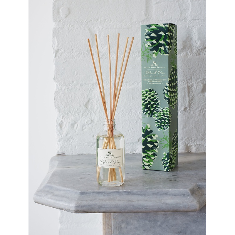 Scent Category:WoodyTop Notes:Fir Needle, Cilantro, PineMiddle Notes:Cedarwood, Winter BerriesBottom Notes:Sandalwood, MuskExperience Roland Pine, our best-selling scent, year-round with Soap & Paper Factory's 3.65 oz Reed Diffusers! Flip the reeds regular