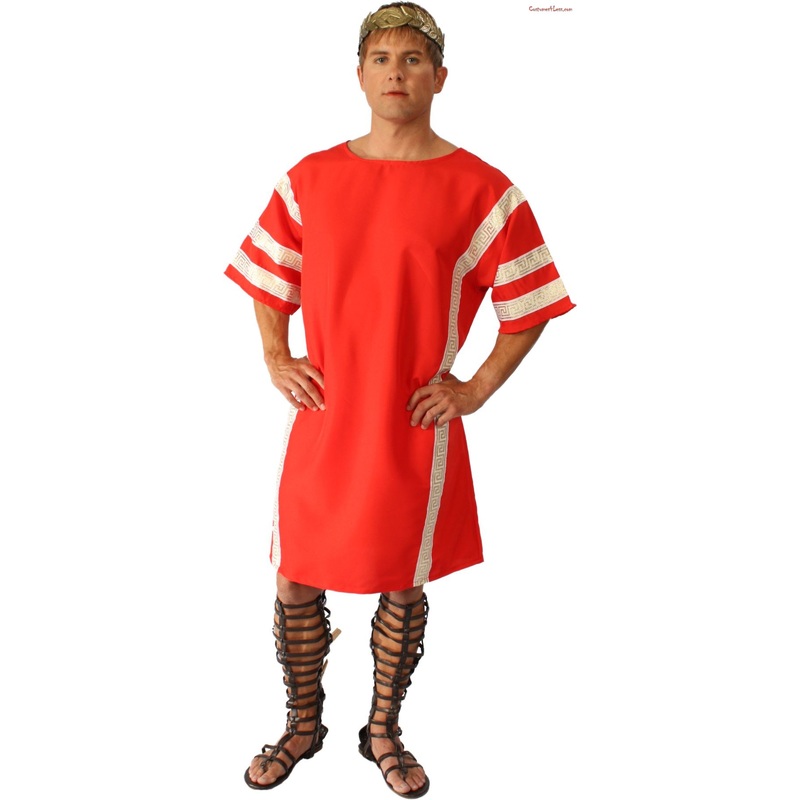 Includes: Knee length red poly knit tunicw/white & gold ribbon trim.Tunic length is approximately 39″.