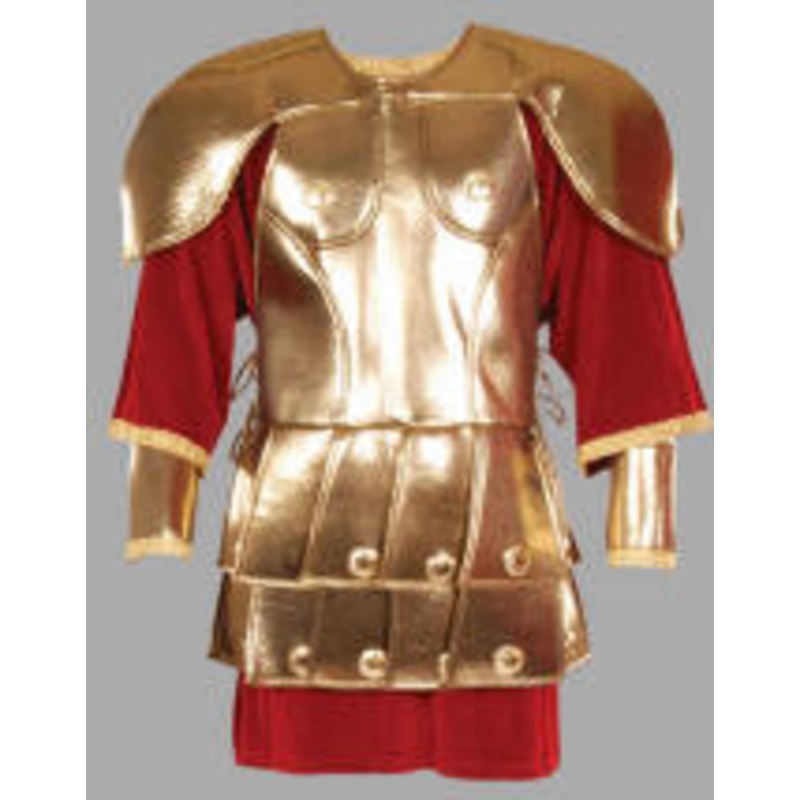 Superior QualityIncludes: Red velvet under tunic accented with gold trim, gold armor accented with gold buttons & trim, matching cuffs.Sizes: One Size