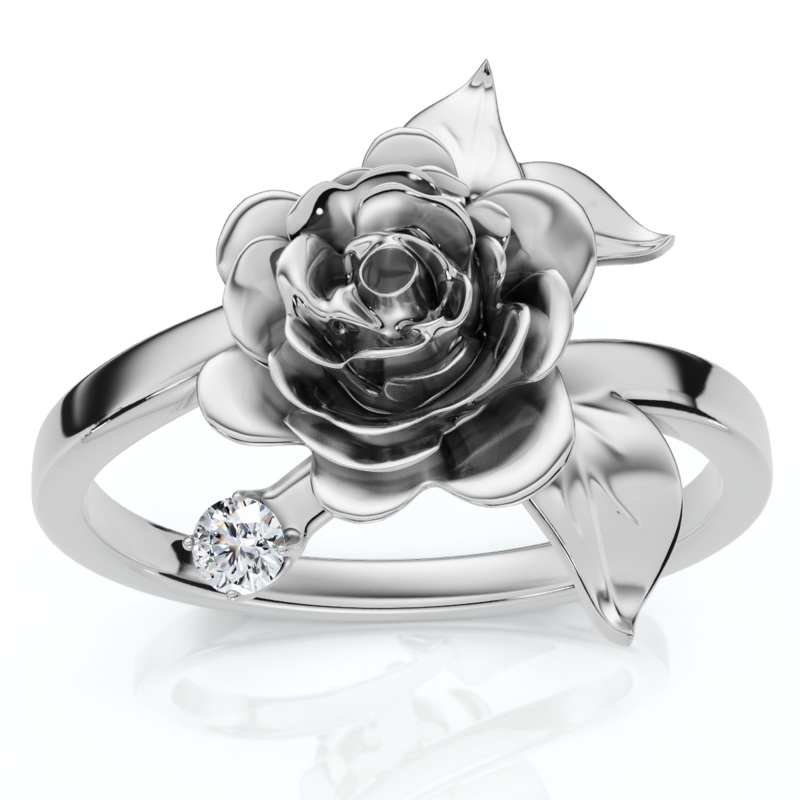 Celebrate your romance with this enchanting Rose and Diamond Engagement Ring. This unique piece features a beautifully sculpted rose and leaf motif, crafted with intricate detail. A single, brilliant lab-grown diamond is set upon a graceful leaf, adding a