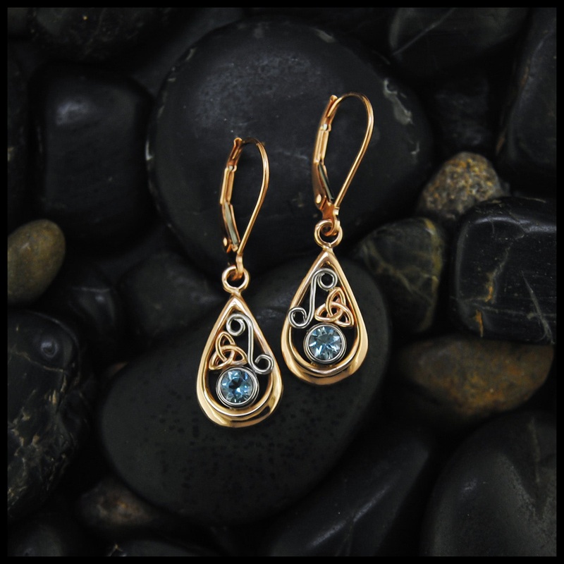 These leverback drop earrings are framed with 14K Rose Gold and setting 4mm Aquamarine stone. Detailing the frame are spiral wire detail in 14K White Gold and an open Trinity Knot is 14K Rose Gold.