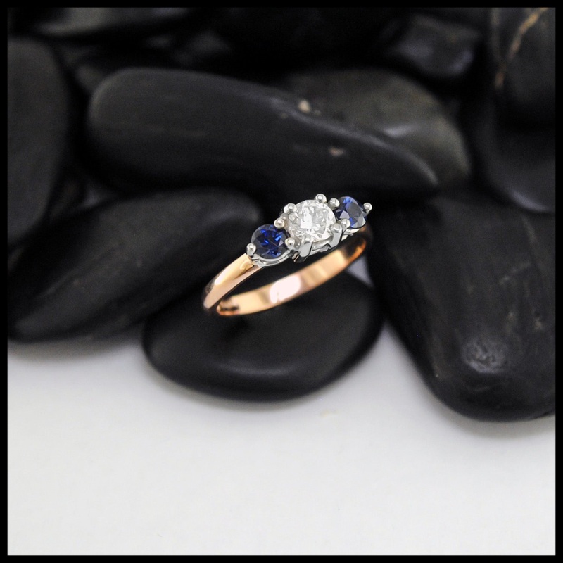 This ring is 14K Rose Gold set with a 0.44CT old cut Diamondin 14K White Gold. On either side of the stone there are3.89CT Sapphires. This ring is a size 7 1/2.