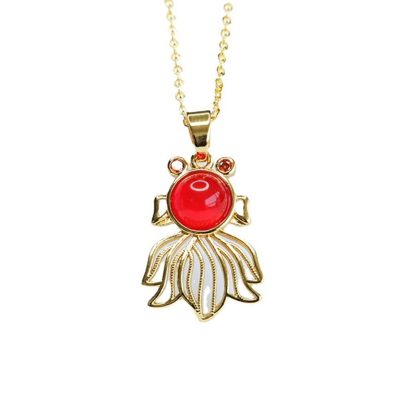 Indulge in the beauty of nature and make a style statement with our Green Chalcedony Goldfish Pendant. Embrace good fortune and let your unique style shine with this captivating piece.