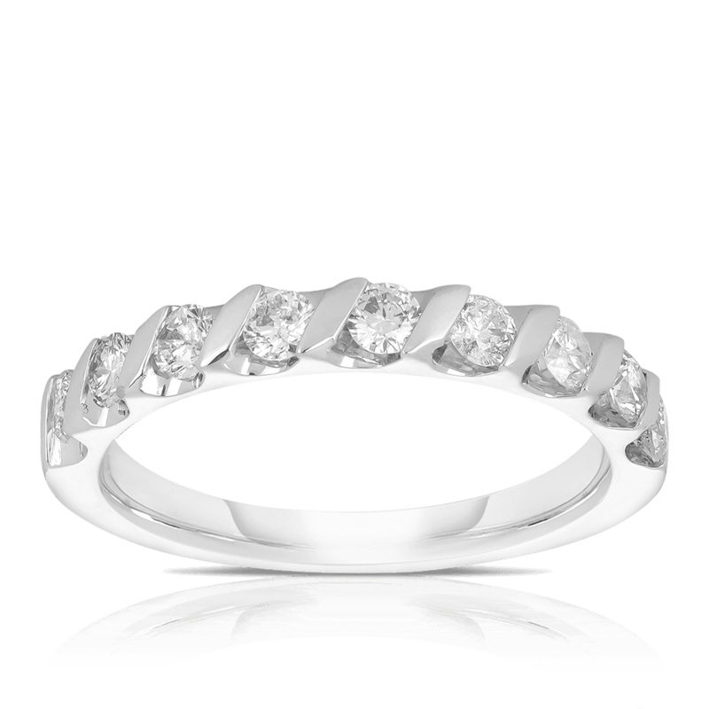 An 18ct White Gold Anniversary ring with a unique slanted bar setting and Round Brilliant Cut Diamonds.