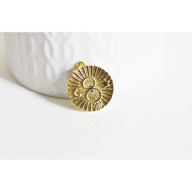 A pretty round medal in textured gold-plated brass representing the sign of infinity and decorated with a zircon crystal, a moon and a star Dimensions: Diameter: 22.5mm Width: 20mm Thickness: 2.5mm Hole: 3mm. Metal: nickel-free gold-plated brass Other gold