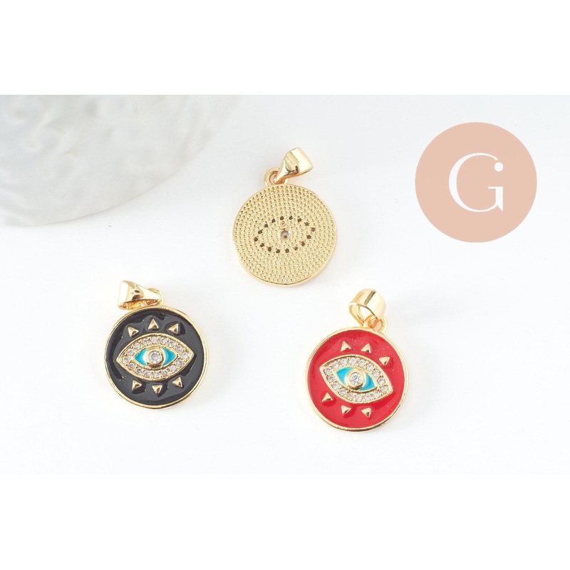 Round medal pendant with red enamel eye, 18K gold-plated brass and zircon crystal, love brass pendant for jewelry creation, 16mm, x1 (G3298)