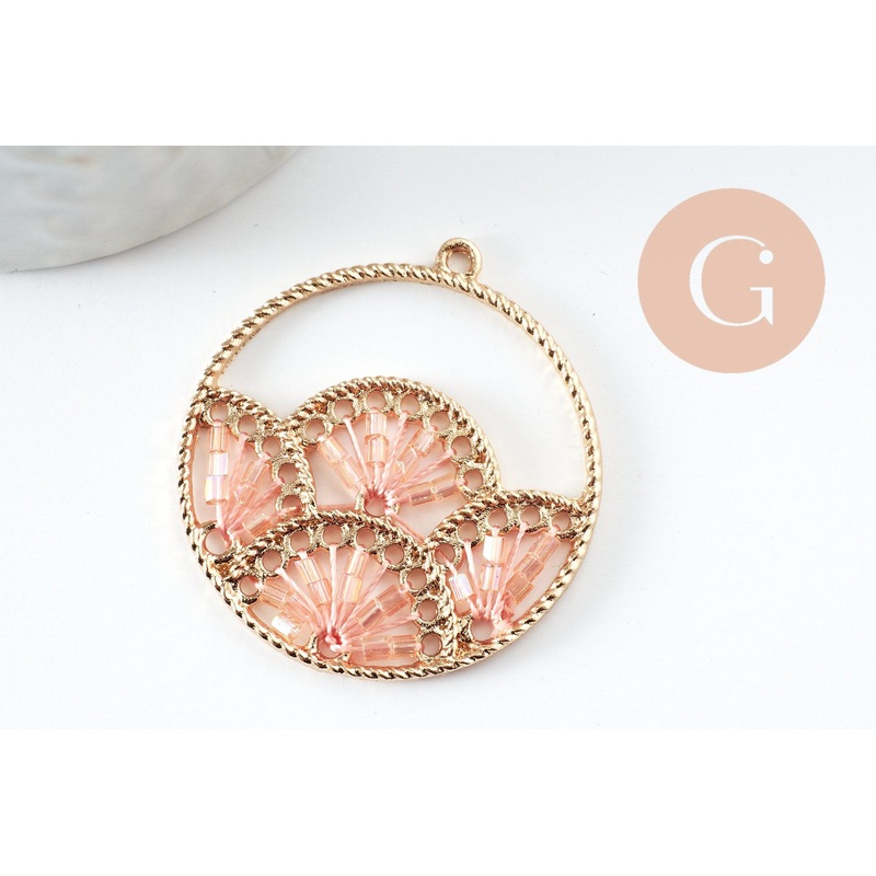 Round pendant in zamac gold-plated woven seed beads, pink lace, 37.5mm, x2 (G4131)