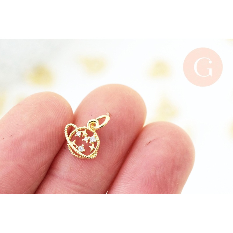Round planet and stars pendant in 18K gold-plated brass with zircon, a gold-plated pendant with crystals for jewelry creation, 10.5mm, x1 G5517
