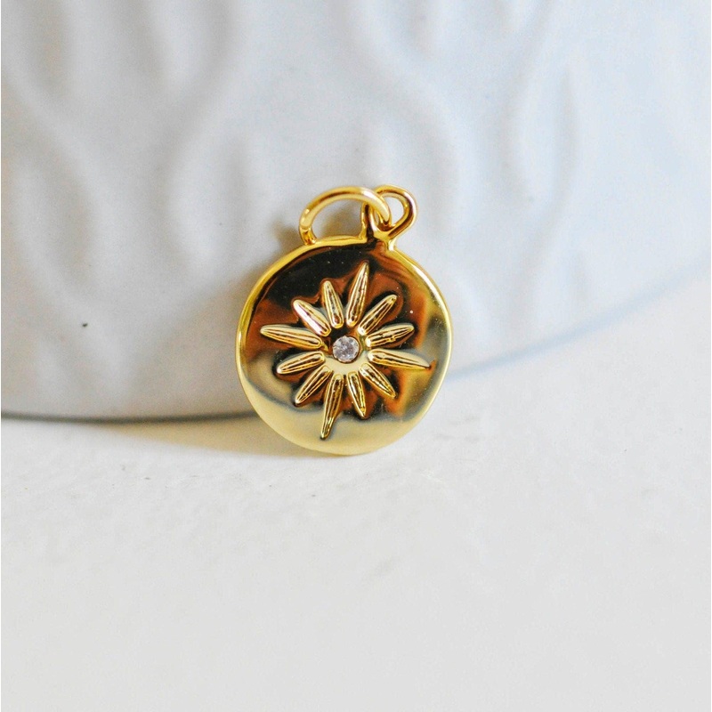 A pretty round medal in gold-plated brass decorated with white zircons representing a star Dimensions: Length: 15mm Width: 12 Thickness: 2mm Hole: 3.5mm. Metal: nickel-free gold-plated brass Other gold pendants are available in the shop: https://www.etsy.c