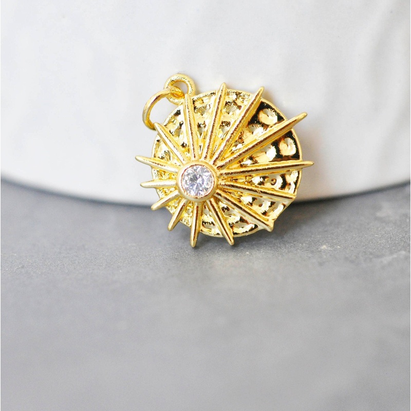 A pretty round medal in gilded brass decorated with a white zircon representing a sun and its rays. Dimensions: Length: 18mm Width: 18mm Thickness: 2.5mm Hole: 3.4mm. Metal: nickel-free gold-plated brass Other gold pendants are available in the shop: https
