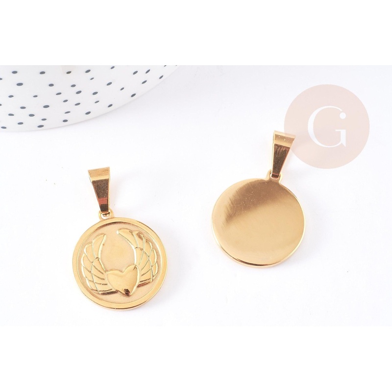 Round winged heart medal pendant in golden steel, golden pendant, nickel-free, golden steel, jewelry creation, gold medal, 2.85cm