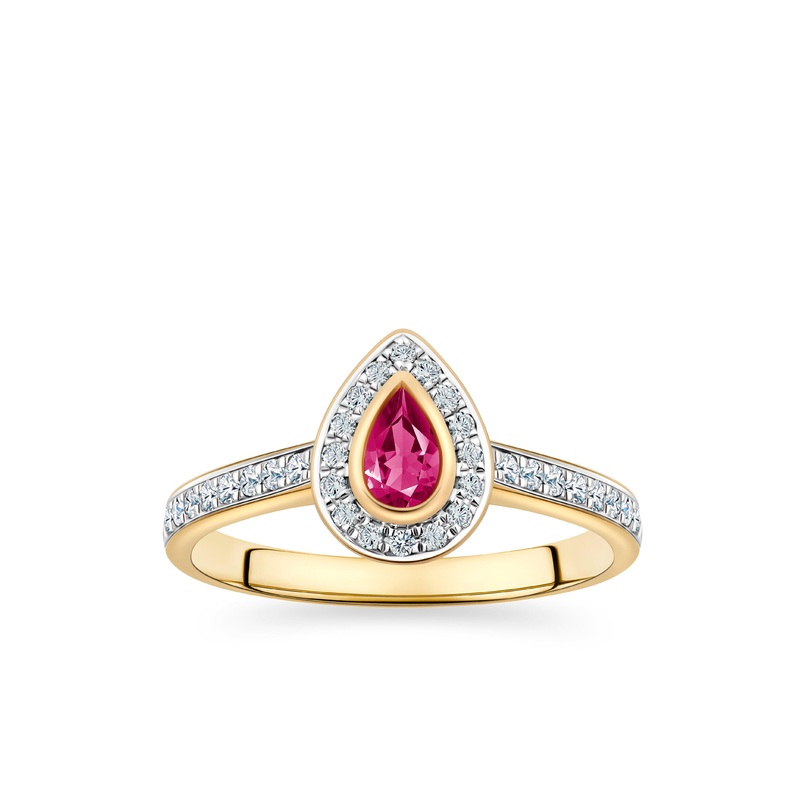 Be the first to review “Ruby and Diamond Halo Ring in 9ct Yellow Gold”