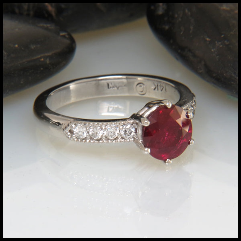 The Ruby Solitaire with Diamond band is a classic and elegant handmade custom creation. The14K White Gold band is set with a center 1.76 carat (7.5mm) round ruby solitaire with8 accent diamonds totaling approximately 1/4 carat (2mm, 0.03 cts each).