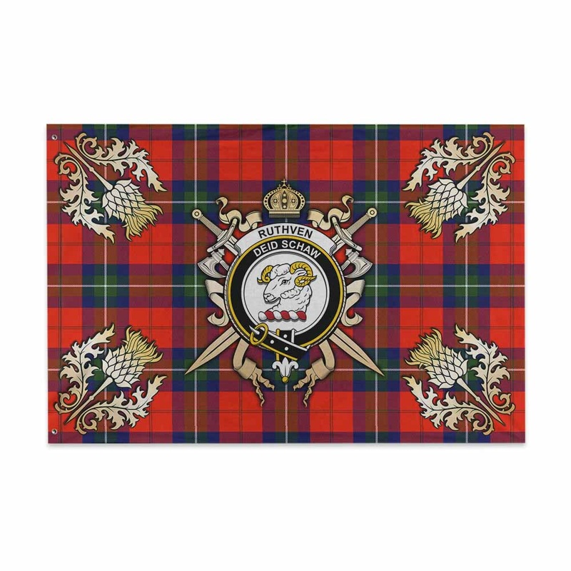 Ruthven Tartan House Flag with Family Crest and Golden Thistle Crossed Sword Design