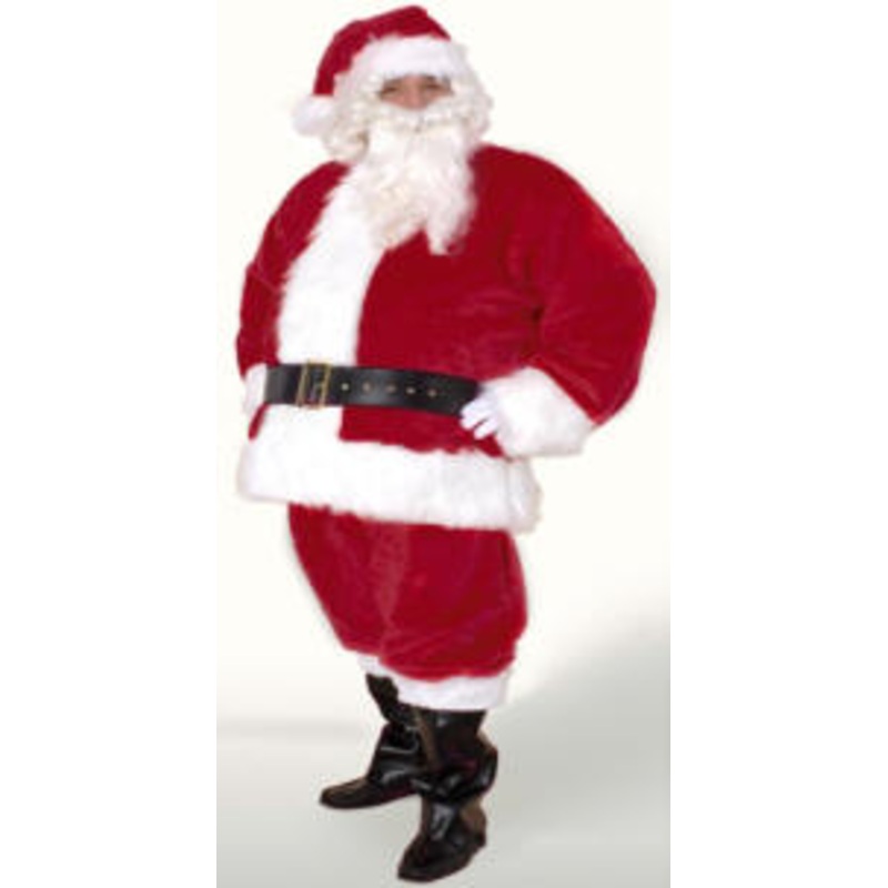 Premier grade Premium Santa Suit!Jacket, pants & hat are made of thick deep red velour, accented with luxurious white plush fur. Jacket is fully lined with partial nylon satin, full front opening with hidden zipper, inside pocket & two side belt loops. Ela
