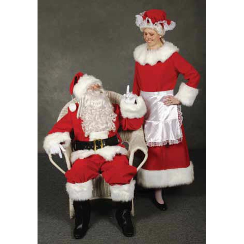 Includes: Zippered coat partially lined w/satin, extended sleeve cuff, belt loops, matching pants w/side pocket, black naugahyde belt w/gilt buckle, hat w/large pom-pom, black naugahyde boot tops w/long hair white fur trim & white nylon Santa gloves.