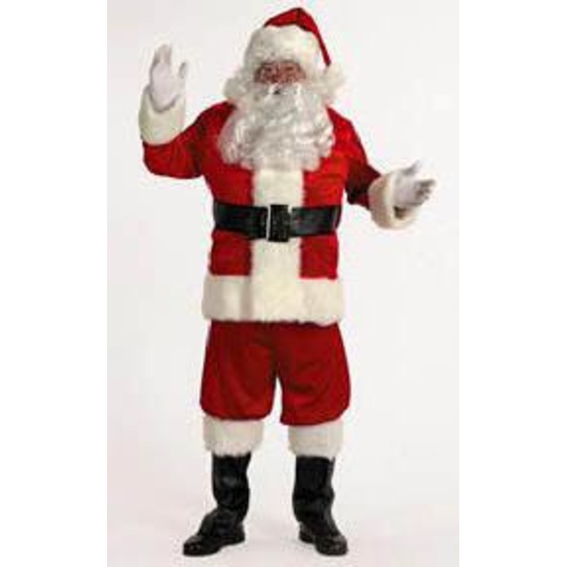 Includes: Lightweight yet durable red velour front zipper coat accented w/Luxurious white long-hair plush trim & belt loops, matching pants, hat w/large pom-pom, bound belt (w/eyelets, gilt buckle w/prong & loop), deluxe vinyl boot tops w/long white hair plush cuffs & white knit Santa gloves.