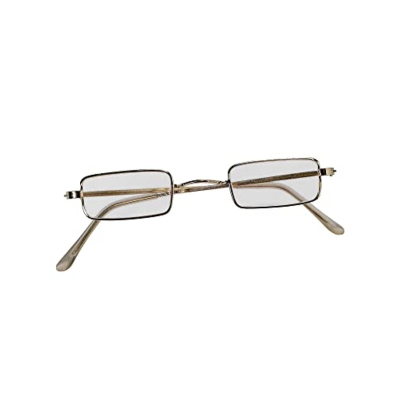 Includes: One pair EyeglassesColor: Gold Metallic Frame with clear lens (shown)Size: One SizeUse for Santa Claus, Ben Franklin, Hipster / Clear Glass / No MagnificationFR24907 / R427