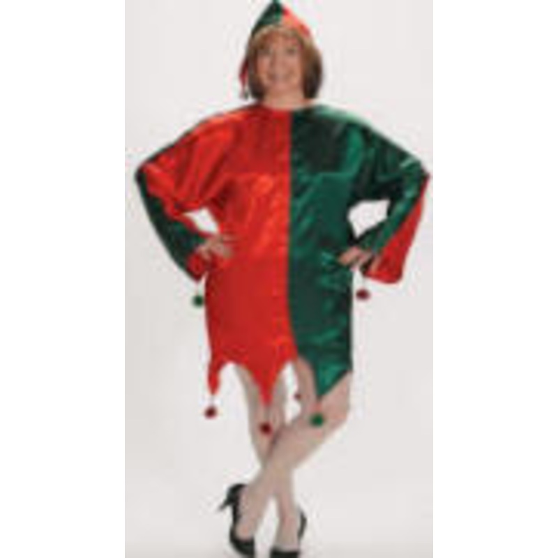 Includes: Red & Green Satin Elf tunic trimmed with red & green glitter pom poms & hat with jingle bell.