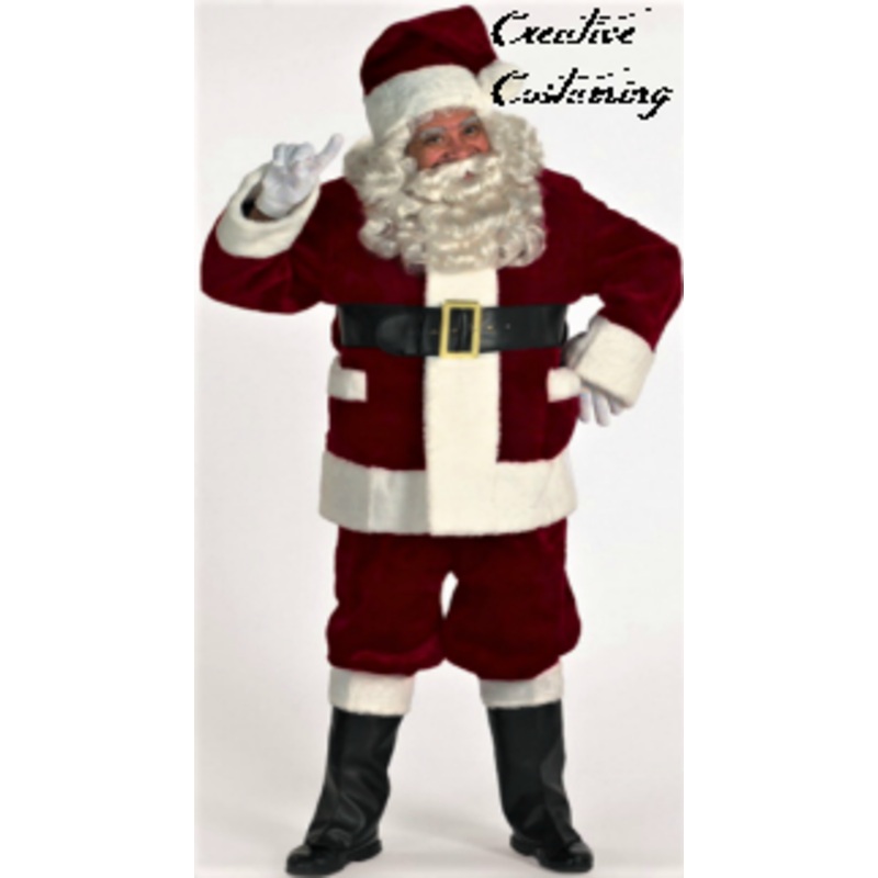 Burgundy pile plush partially lined coat w/white pile plush trim. Front zipper coat w/belt loops &deep satin lined outside pockets. Matching pants w/side pocket, hat w/large pom-pom. Bound black belt w/eyelets, gilt buckle with prong & loop,deluxe vinyl boot tops w/white pile plushcuffs & white knit Santa gloves.