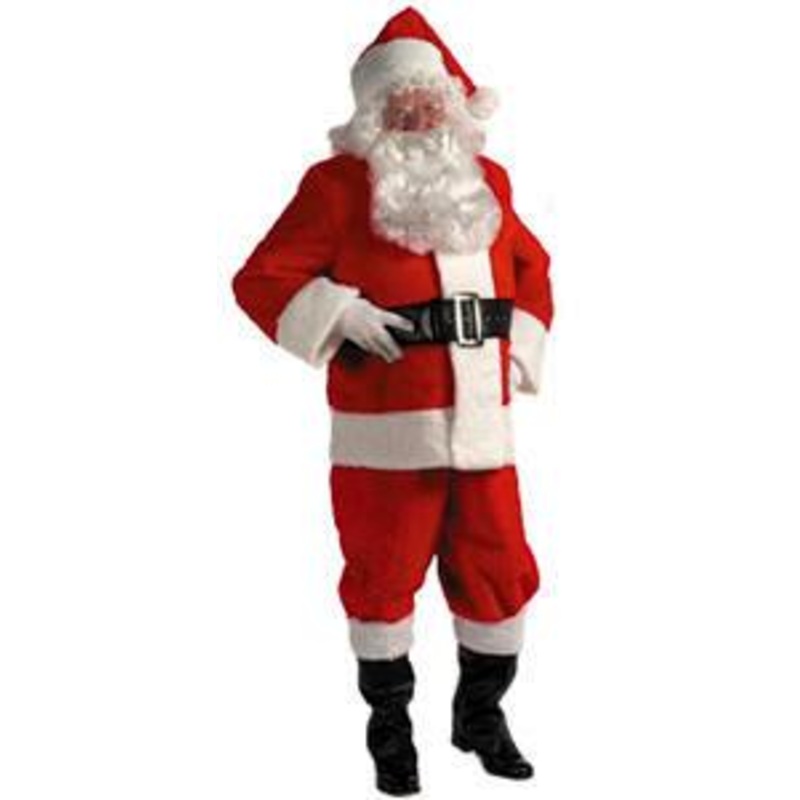 Includes: Deluxe red pile plush front zipper coat accented w/deluxe white pile plush trim & belt loops, matching pants, hat w/large pom-pom, bound belt (w/eyelets, gilt buckle w/prong & loop), deluxe vinyl boot tops w/deluxe white pile plush cuffs & white knit Santa gloves