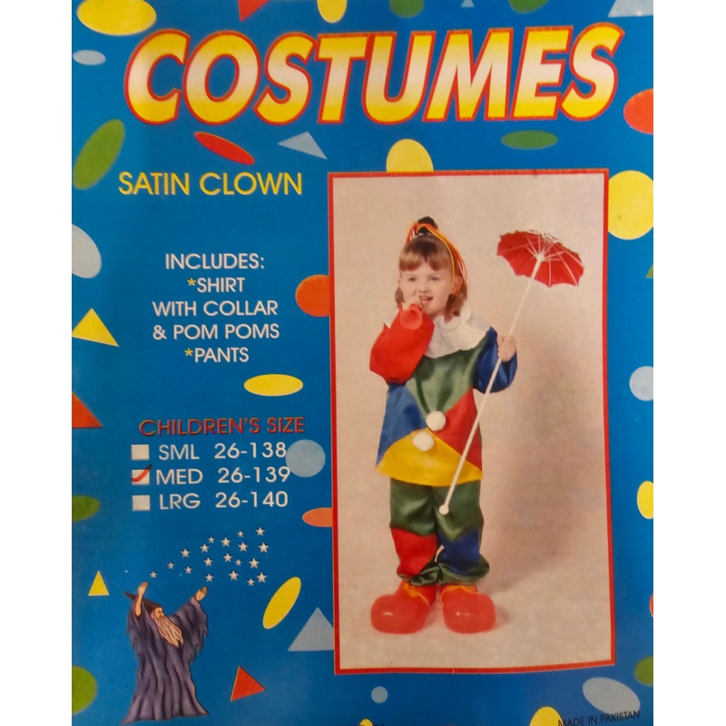 Alexanders Costumes Satin Clown Child CostumeIncludes: Shirt with Collar, Pants, Pom PomsSize: Child Medium, LargeColor: As ShownA26139 / A26140