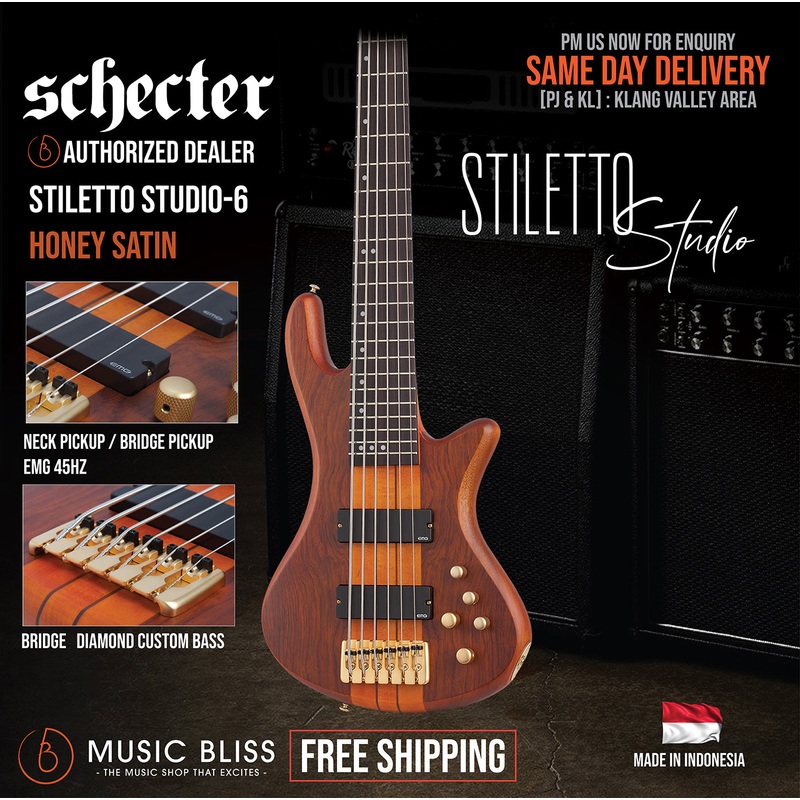 Schecter Stiletto Studio-6 6-String Electric Bass Guitar - Honey Satin (MIK)SPECIFICATIONS General- Model Name : Stiletto Studio-6- Item Number : 2730- Country of Origin : South Korea- Guitar Color Shown : Honey Satin (HSN)Neck- Tuners : Schecter- Fretboar