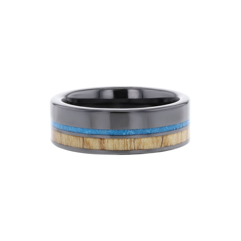Introducing the Schmidt Baseball Wood Inlay Wedding Ring, part of our men’s collection! Exclusively designed with an 8mm width and a genuine vintage baseball bat wood inlay plus 1mm turquoise inlay – it’s a homerun of style and class. Strike out your competition with this unique ring!