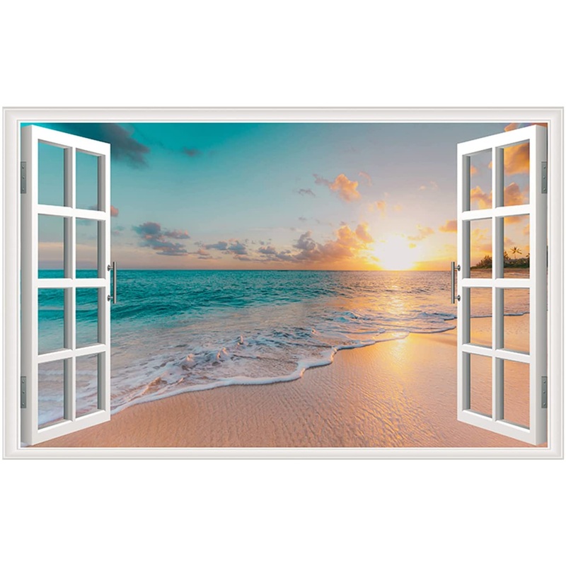 Sea Beach Wall Sticker Sunset Seascape Fake Window Wall Stickers Tropical Sandy Beach Faux Window Wall Decal Removable Ocean Landscape Window View This high-quality canvas can be used to add color and life to any space. The canvas features state-of-the-art