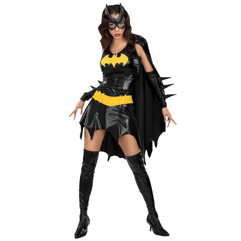 Includes: Dress with attached cape, glovelets,vinyl eyemask, vinyl belt& boot tops