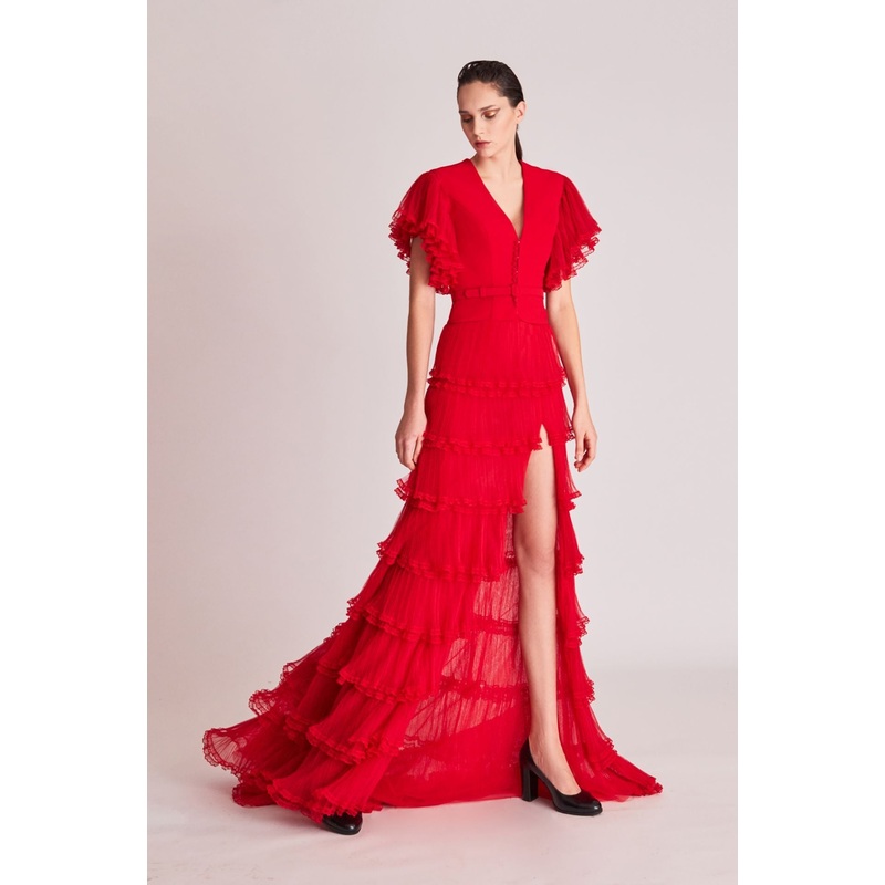 Red short-sleeved top. Featuring a V neckline, buttons down the midline, a waist belt, and short bell sleeves with ruffled edges. Complemented with multilayered ruffled flared A-line skirt, and a front side slit.