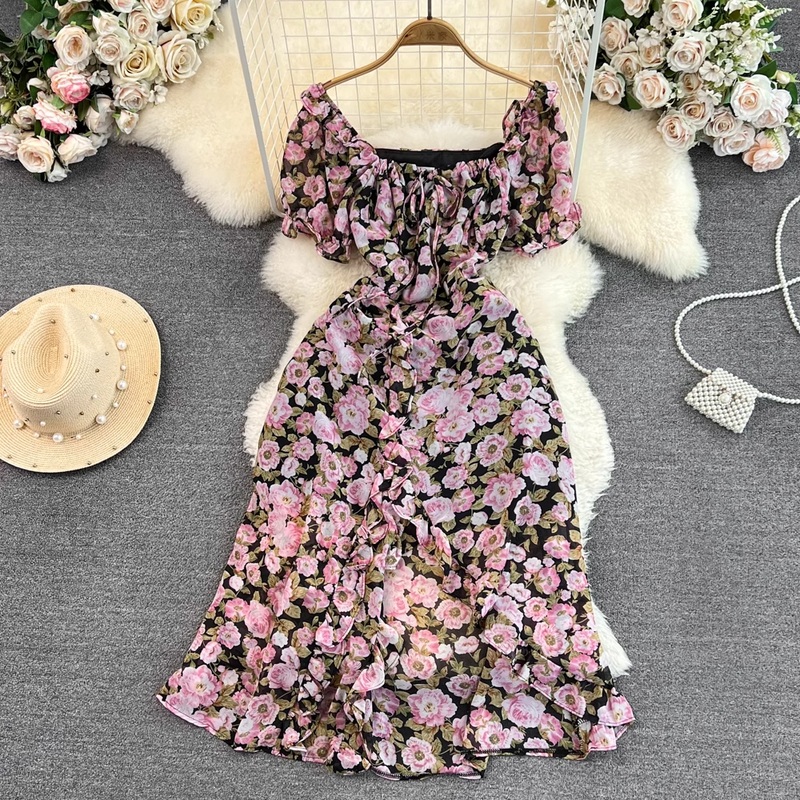 Short Sleeves Square Neck Mid Length Slit A Line Floral Chiffon Ruffles Dress 1676
