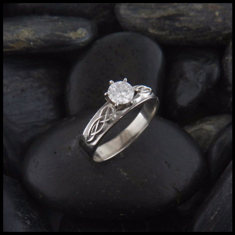 This unique Celtic Knot EngagementRing is set with a Diamond solitaire with celtic knotwork on either side. This ring is available in14K Yellow, Rose or White Gold in sizes 4 to 14.1/4ct diamondSI GH1 1/3ct diamondSI GH1 1/2ct diamond SI GH1 Item number:R4