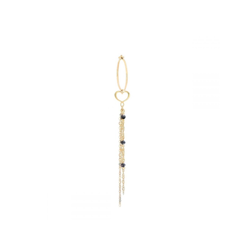 Single hoop earring in 18k gold from the Les Petits de Maman Collection. The earring features a cascade of chains and a rosary of black diamonds. There is also a 6 mm Maman petit heart. The total length of the earring, including the 13mm diameter hoop, is