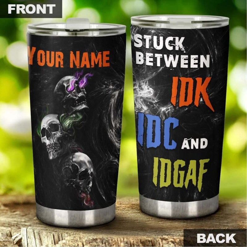 Skull Stuck Between IDK IDC And IDGAF Personalized Tumbler-Skull Tumbler-Fancy Skull Birthday Gift Christmas gift for her for him