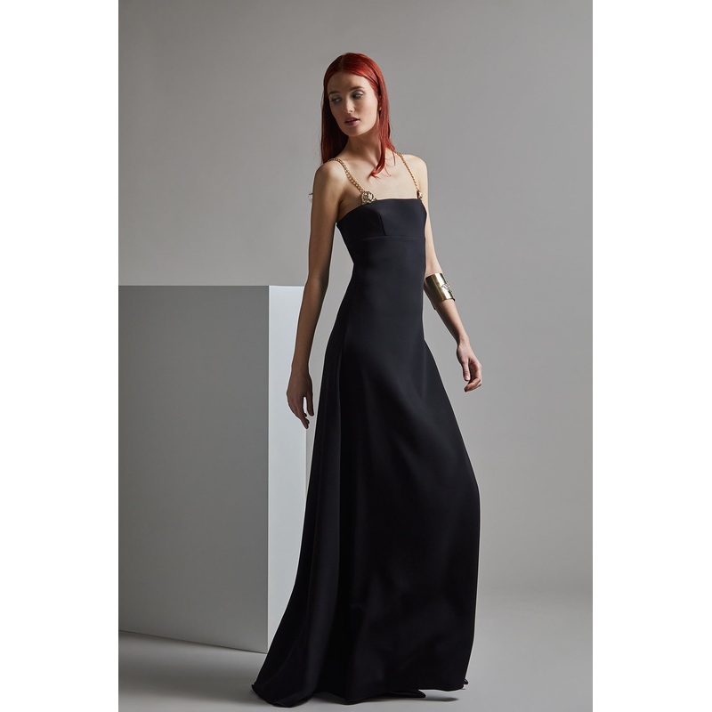 Black sleeveless A-line dress. Featuring a straight neckline, and gold spaghetti straps. Complemented with a fitted bodice, and an A-line skirt.