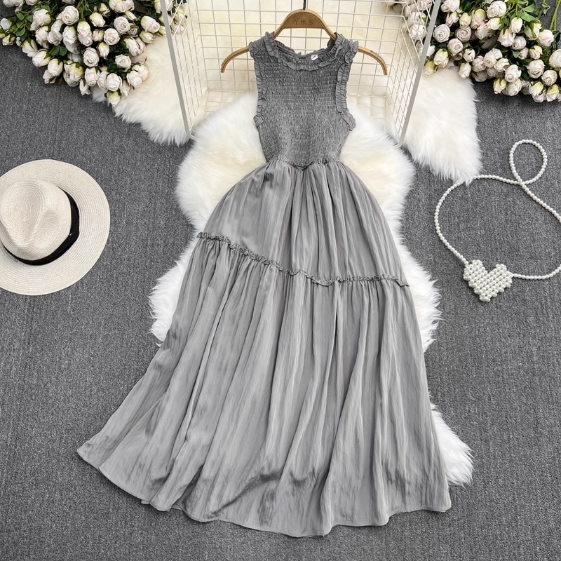 Product NO. :947Color: grayWaist type: high waistSize:S,M,L,XLSkirt length: mid-length skirtCollar type: round neckSleeve: SleevelessSize details(cm):S: full length 113 bust 46-102 shoulder 25 waist 54-100M: full length 114 bust 50-106 shoulder 26 waist 58