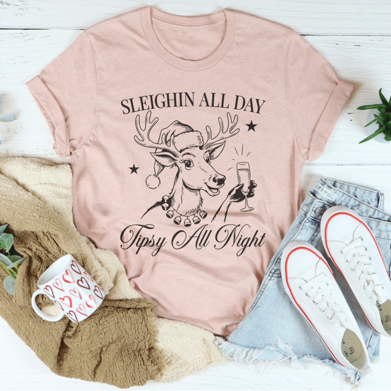 Celebrate the festive season with a twist in our “Sleighin’ All Day Tipsy All Night” t-shirt. This fun and festive tee is perfect for holiday parties or casual get-togethers where you want to show off your holiday spirit with a cheeky flair. Its a great pick for those who love to combine the joy of the season with a bit of merrymaking.