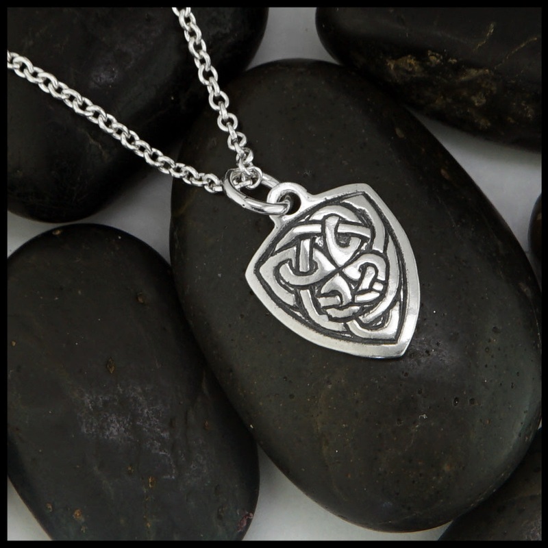 Small Michael'sShield Pendant in Sterling Silver features intricate Celtic knotwork that forms a continuous path across the pendant. The Shield pendant is available with your choice of chain or without a chain. Pendant shown on an 18" Sterling Silver cable