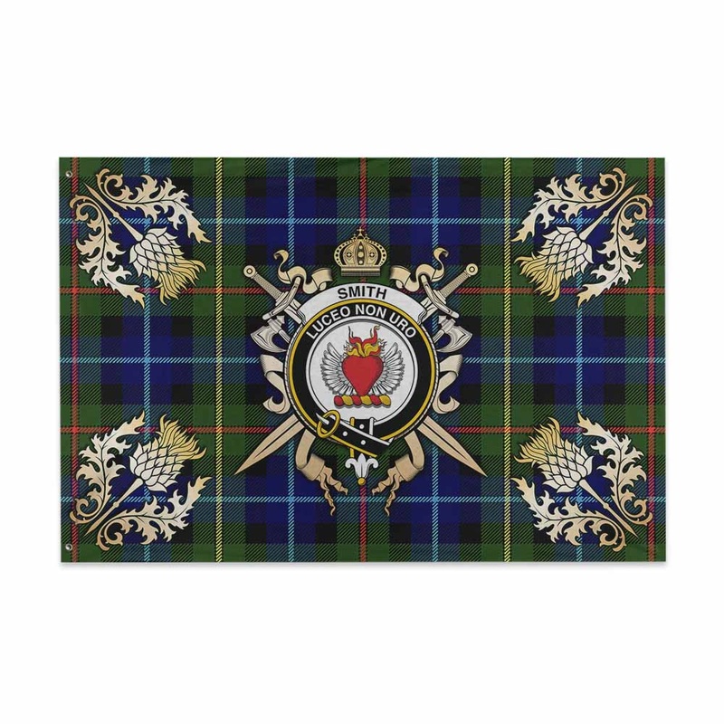 Smith Tartan House Flag with Family Crest and Golden Thistle Crossed Sword Design