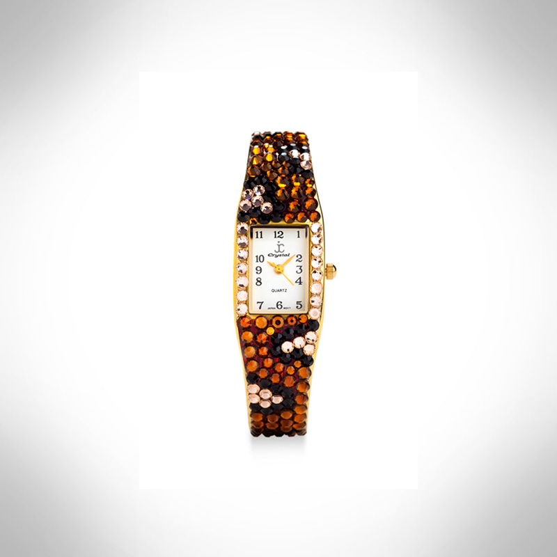 Elegant gold-tone, watch featuring sparkling crystals accents on both the bezel & bangle Embellished with crystals, which are set by Jimmy Crystal's expert craftsmanship. This product provides unparalleled aesthetics to transcend elegance. Logo at 12 o