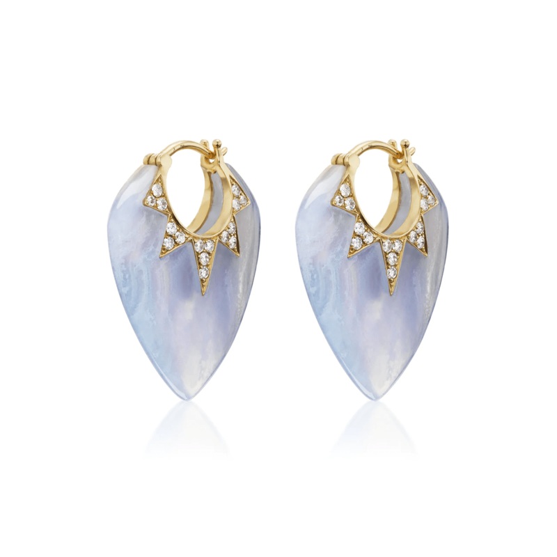 Awaken your inner rockstar with these handcrafted 18K yellow gold earrings in a guitar pick shape with carved blue lace agate