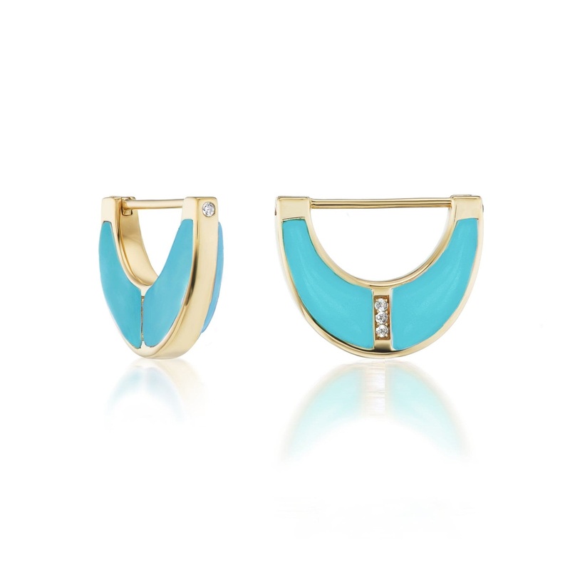 18k yellow gold huggie earrings with turquoise inlay and diamonds.